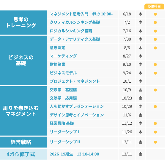 ・約半年間で経営学16科目を効率良く学べる、女性リーダー育成プログラムです。