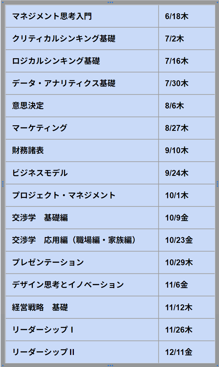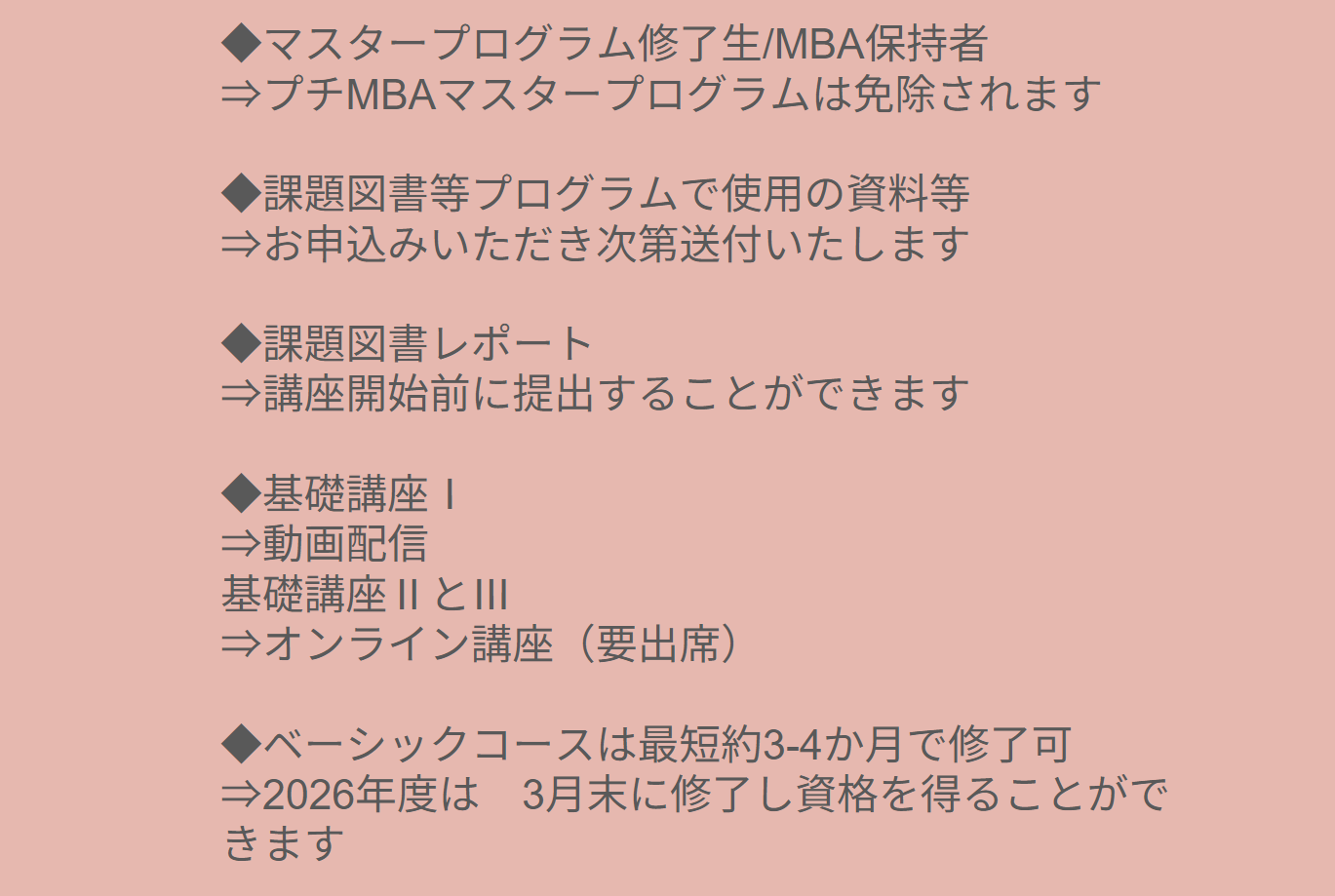 | ベーシックコース | マスタープログラム修了生 / MBA保持者 | 180,000円 | 140,000円 |